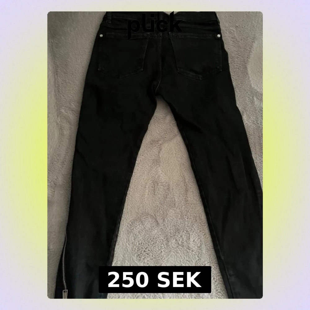 Säljer ett par svarta skinny jeans med dragkedjedetalj längs hela sidan av benen. Jeansen har två bakfickor och är i stretchigt material för en tight passform. Perfekta för en edgy och trendig look.