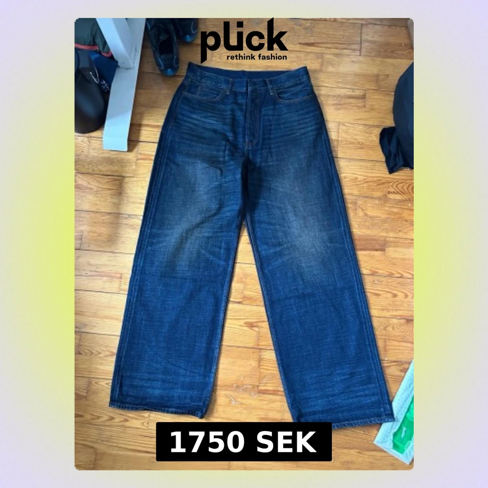 Säljer ett par mörkblå jeans med breda ben och klassisk femficksmodell. Jeansen har en lätt tvättad look med subtila slitningar framtill och bakfickor. Materialet är kraftig denim i bomull. Perfekta för en avslappnad och trendig stil.