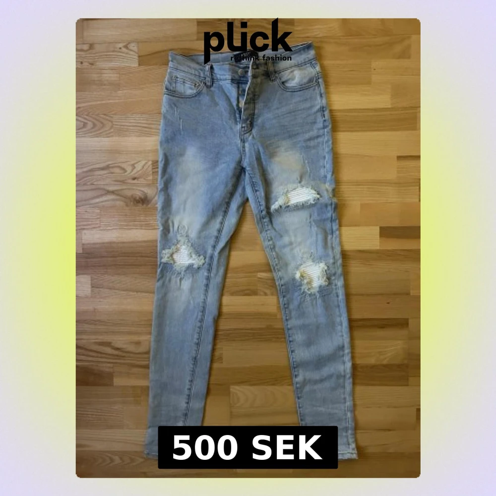 Säljer ett par ljusblå skinny jeans från Amiri med slitningar och hål på båda benen. Jeansen har klassisk femficksmodell, hög midja och dragkedja med knapp. Perfekta för en avslappnad och trendig look.