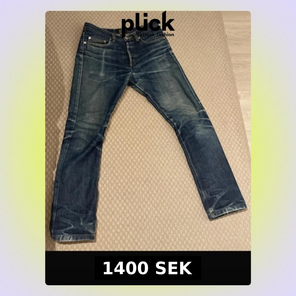 Snygga mörkblå jeans i slim fit-modell med tydliga slitningar och ljusare partier på lår och knän. Klassisk femficksdesign och raka ben. Perfekta för en avslappnad och trendig look. W28 och L30. Säljer för 1400kr för att det är feta men kan lätt gå ner med pris så ge mig bara ett bud och får se vad jag kan göra. A.P.C. Modell: Petit Standard