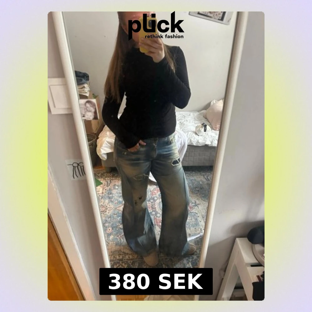 Säljer ett par blåa jeans med utsydda utsvängda ben som har sytt in själv, och slitningar på både fram- och baksida. De är lite slitna längst ner.