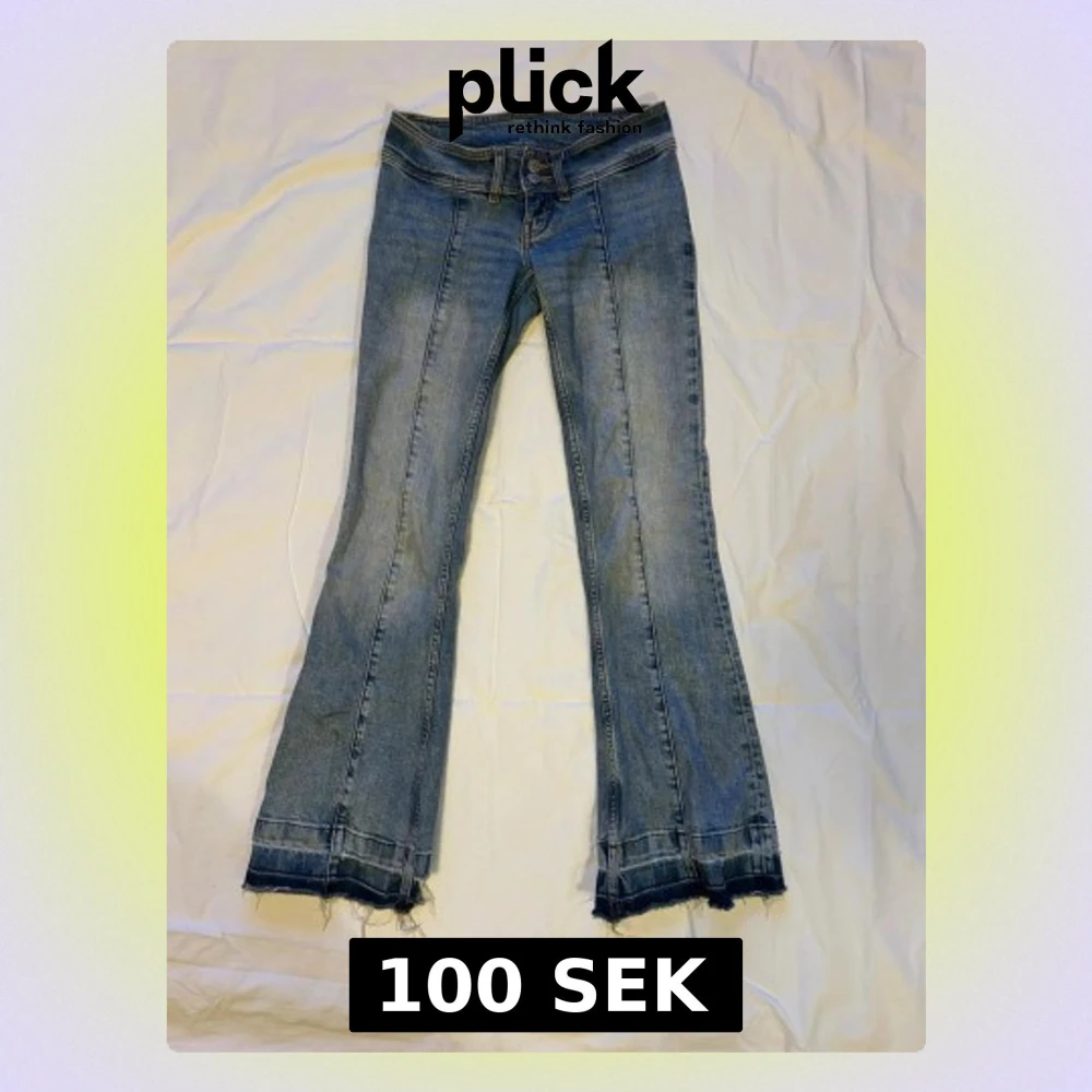 Säljer ett par ljusblå bootcut jeans med markerade sömmar framtill och råa, fransiga fållar längst ner. Jeansen har låg midja och klassisk femficksdesign. Materialet är denim i bomull. Perfekta för en avslappnad och trendig look.
