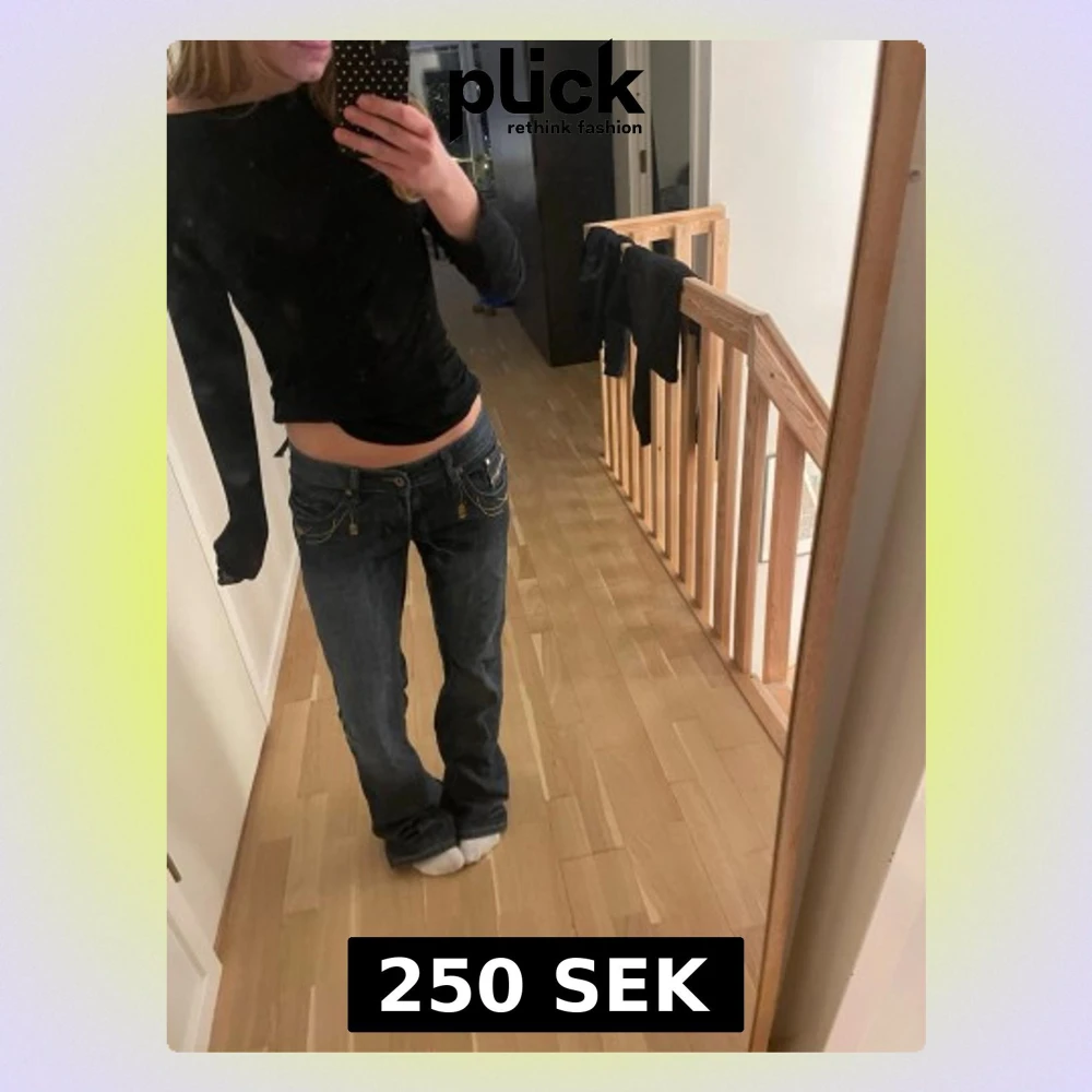 Säljer ett par mörkblå bootcut jeans med coola gula broderier på bakfickorna och nitar på linningen. Jeansen har låg midja och klassisk femficksmodell. Perfekta för dig som gillar en avslappnad men ändå edgy stil. Köpte på plick för 300kr. Pris kan diskuteras!💗