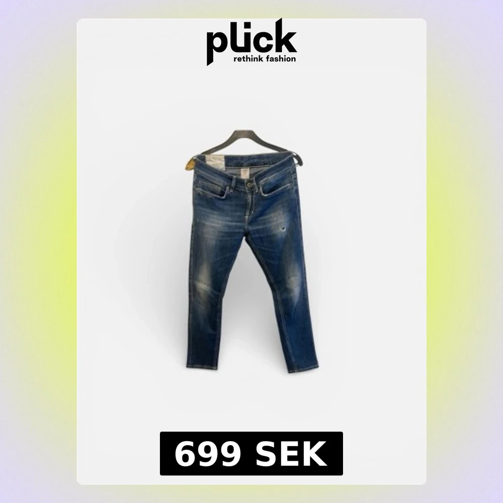 Säljer ett par blå jeans från dondup med klassisk femficksdesign och snygga slitningar framtill. Jeansen har en rak passform och detaljerade sömmar på bakfickan samt ett brunt läderpatch i midjan. Perfekta för en avslappnad och trendig look.