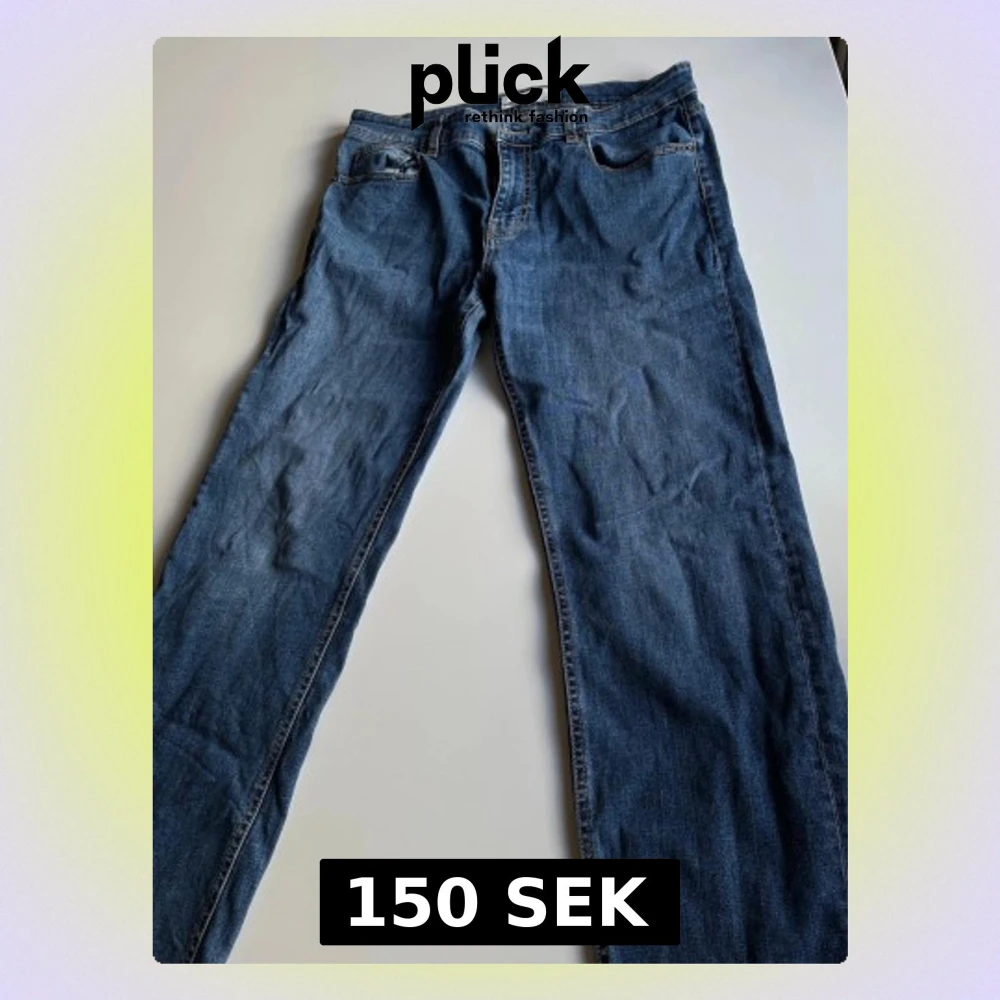 Säljer ett par blå jeans med rak passform och klassisk femficksdesign. Jeansen har normal midja och är tillverkade i denim med kontrastsömmar. Perfekta för dig som gillar en enkel och tidlös stil.