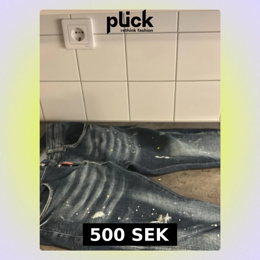 Säljer ett par blå jeans med slitningar, färgstänk och distressed detaljer. Jeansen har klassisk femficksmodell och raka ben. Materialet är denim i bomull och de har en cool, använd look som passar perfekt till streetwear-stilen.