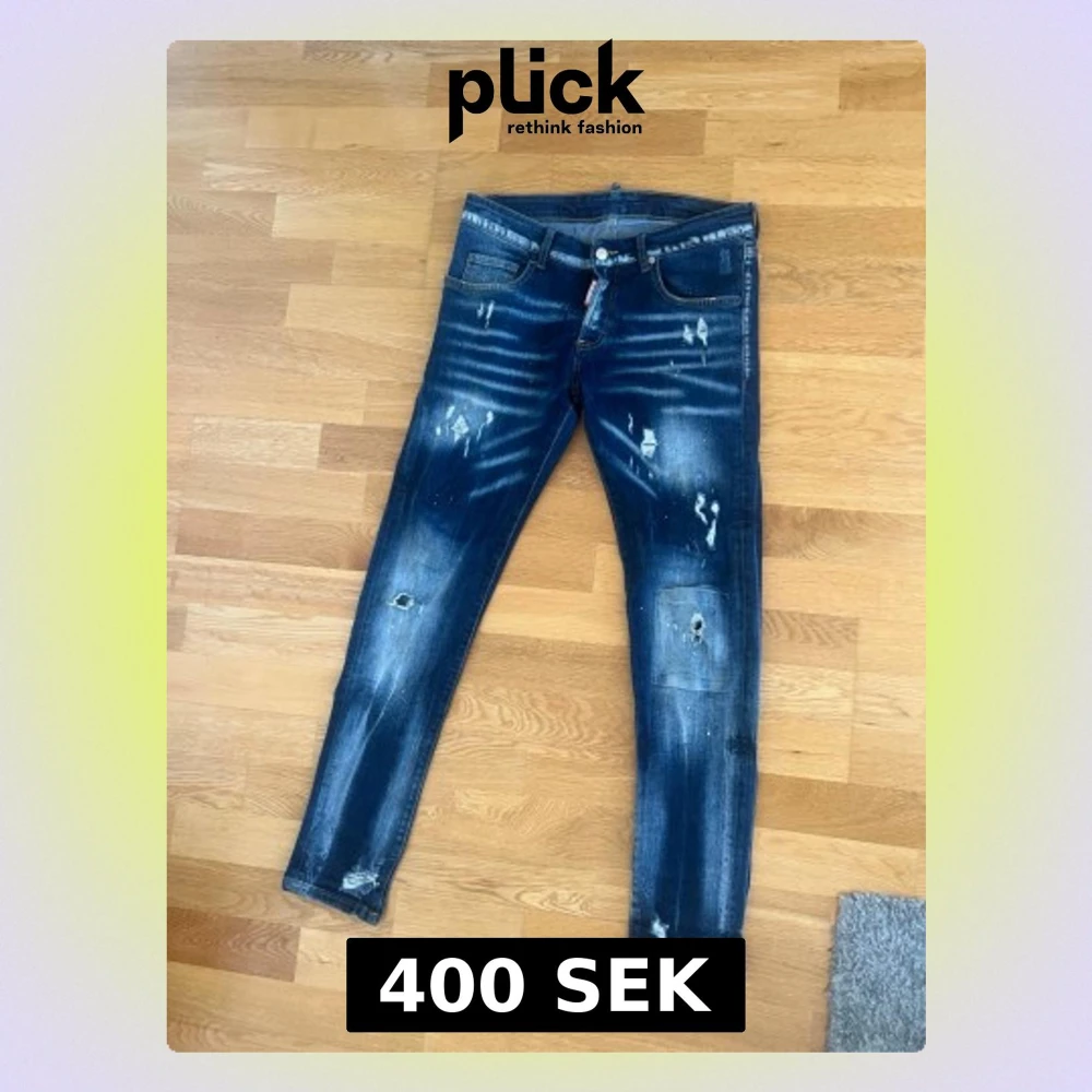 Säljer ett par mörkblå skinny jeans från Dsquared2 med slitningar, hål och patchdetaljer. Jeansen har klassisk femficksmodell, låg midja och tydliga tvättade partier. Materialet är bomull med stretch för skön passform. Perfekta för en trendig och avslappnad look. Dem är lite små i storlek
