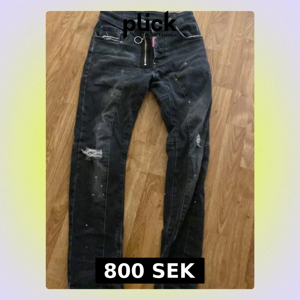 Säljer ett par svarta jeans med slitningar och hål på benen, samt vita färgstänk för en edgy look. Jeansen har en unik dragkedjedetalj framtill och dekorativ ring. Smal passform och cool streetstil.