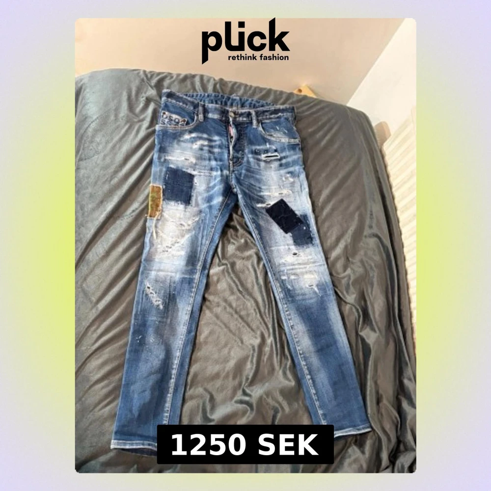 Säljer ett par blå jeans med skinny fit och coola slitningar, patchar i olika färger och detaljer som ger en unik streetwear-look. Jeansen har flera lagade hål och färgstänk för en trendig vibe. Perfekta för dig som gillar en edgy stil.