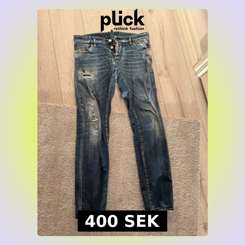 Säljer ett par blå jeans från Dsquared2 med slitningar och distressed detaljer på benen. Jeansen har smal passform, knappgylf och klassiska fem fickor. Snygg tvätt med ljusa partier och coola slitningar för en trendig look.