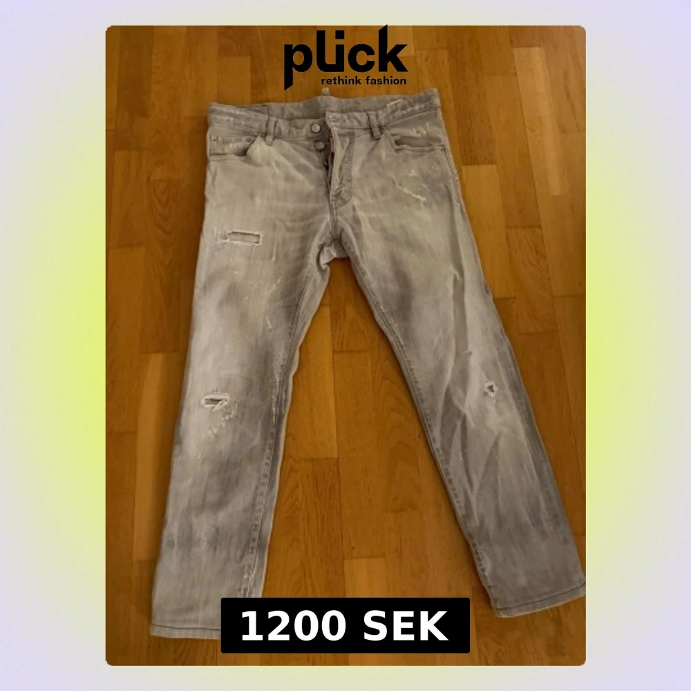 Säljer ett par grå jeans med raka ben och distressed detaljer som slitningar och hål på framsidan. Jeansen har fem fickor, bälteshällor och knappgylf. Perfekta för en avslappnad och trendig look.
