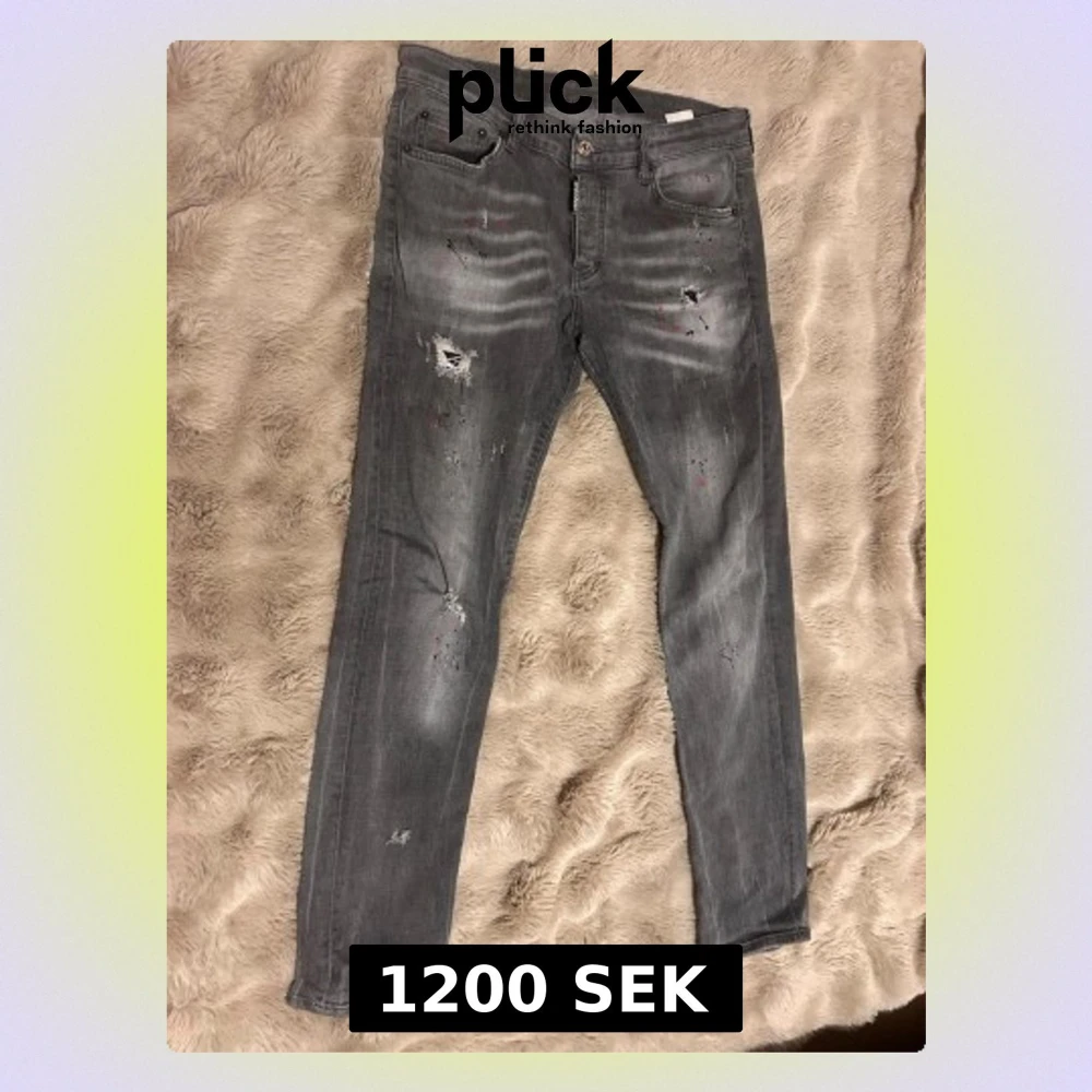 Säljer ett par grå jeans från Dsquared2 med skinny fit och slitningar, hål och färgstänk för en riktigt trendig look. Jeansen har fem fickor, knappgylf och klassisk läderpatch bak i midjan. Perfekta för dig som gillar streetstyle och edgy detaljer.