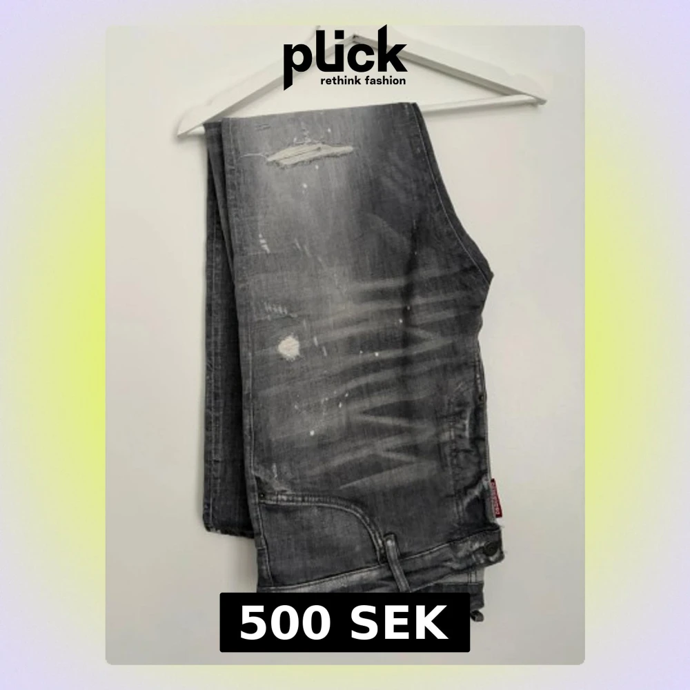 Säljer ett par grå jeans från Dsquared2 med coola slitningar, färgstänk och distressed detaljer. Jeansen har klassisk femficksmodell och synlig röd logotagg vid fickan. Perfekta för en avslappnad streetwear-look.