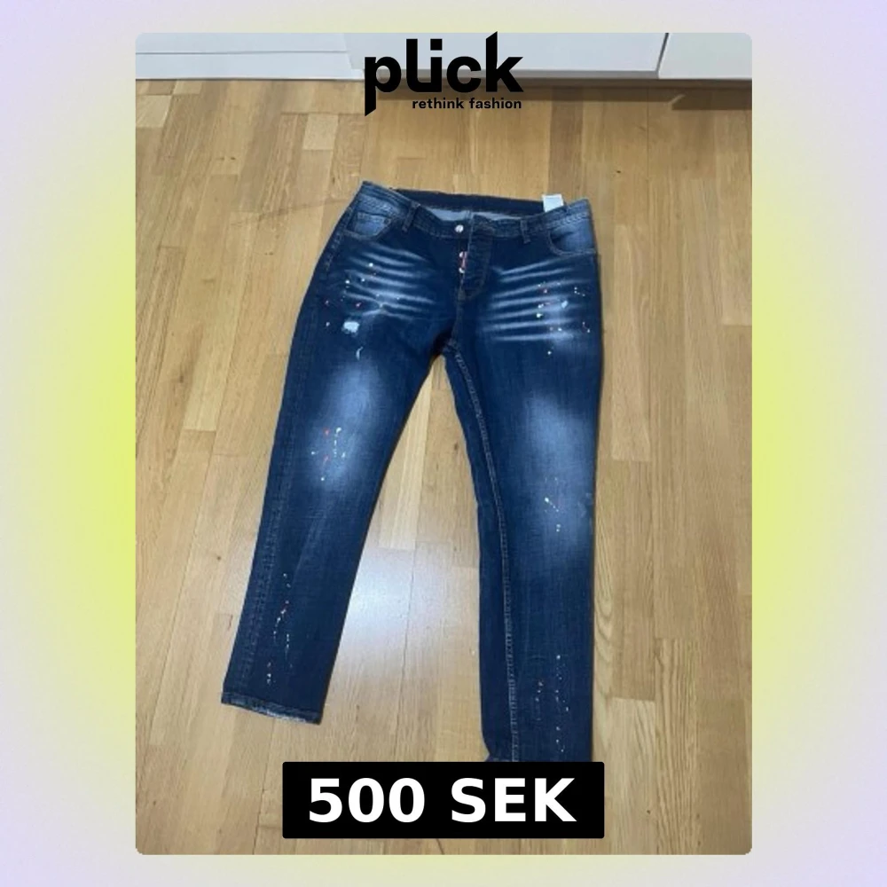 Säljer ett par mörkblå jeans från Dsquared2 med coola färgstänk och slitningar på både fram- och baksida. Jeansen har smal passform, klassiska fem fickor och är tillverkade i denim. Perfekta för dig som vill ha en unik och trendig look.
