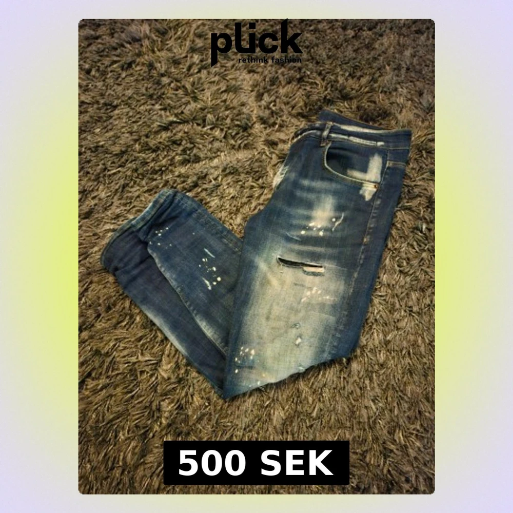 Säljer ett par blå distressed jeans från Dsquared2 med slitningar, färgstänk och håldetaljer. Jeansen har klassisk femficksmodell och är tillverkade i denim med snygg tvättad look. Perfekta för dig som gillar en edgy och trendig stil.