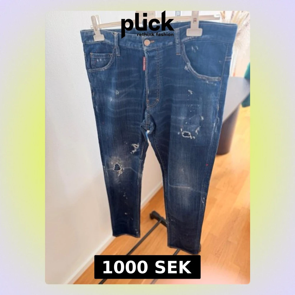 Säljer ett par mörkblå jeans från Dsquared2 med distressed detaljer, hål och färgstänk för en riktigt edgy look. Jeansen har smal passform, klassiska fem fickor och knappgylf. Perfekta för dig som gillar streetstyle och vill sticka ut.