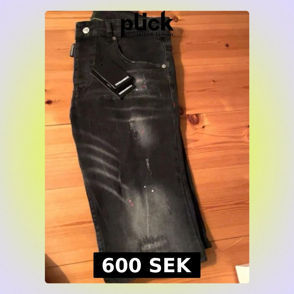 Säljer ett par svarta jeans från Dsquared2 med coola slitningar och färgstänk. Jeansen har klassisk femficksmodell, silverfärgade knappar och en röd logotyppatch bak i midjan. Materialet är denim med stretch för skön passform. Perfekta för dig som gillar streetstyle.