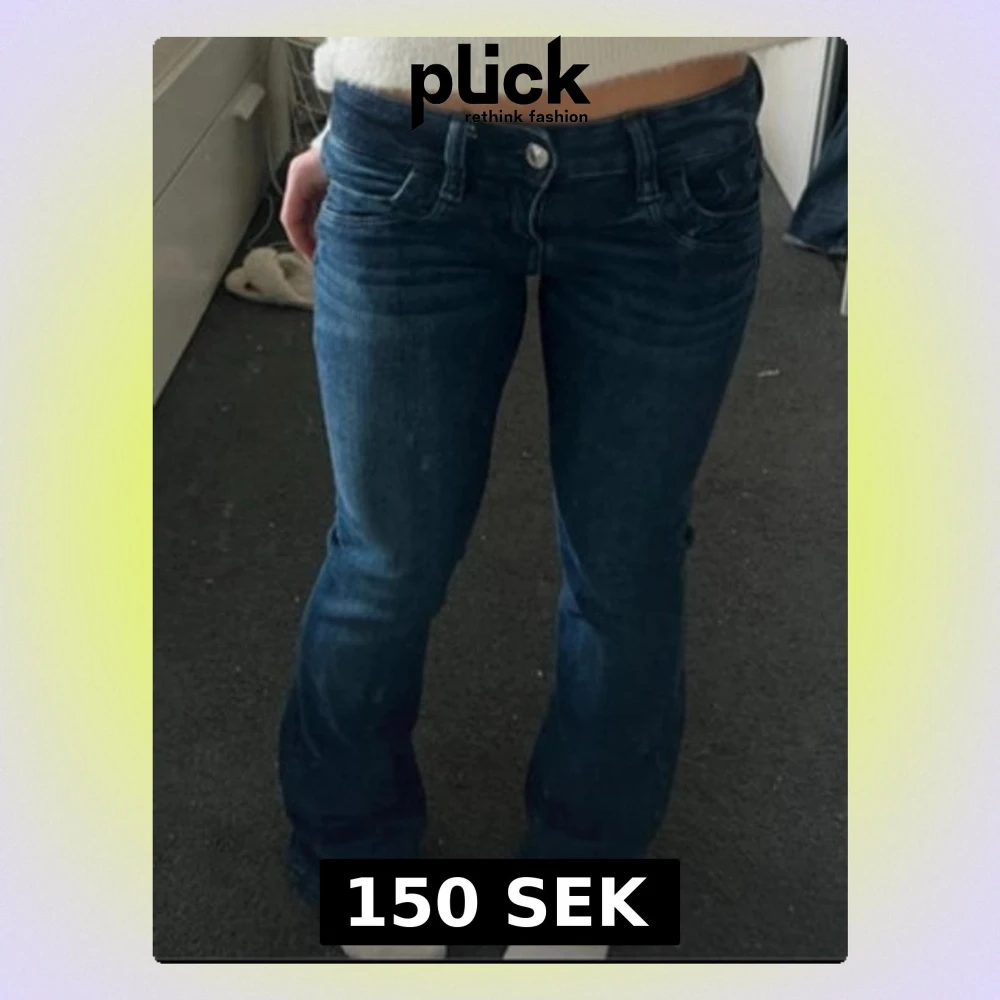 Snygga blå jeans med bootcut-modell och låg midja i storlek 146 i barnstorlek men passar mig som vanligtvis har st 32-34! Men dem är på gränsen till för korta för mig som är 164 cm lång💕Jesnsen är aldrig används bara testat dem
