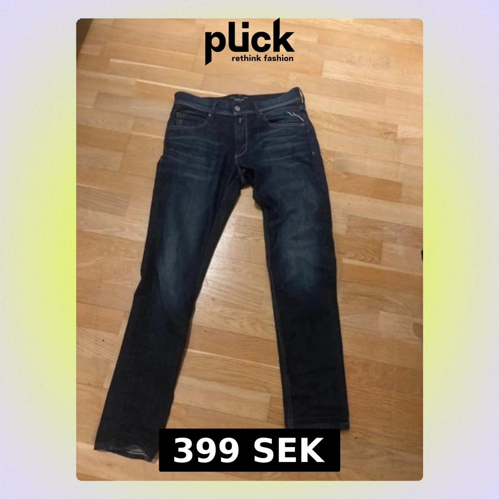 Snygga mörkblå jeans från Replay. Jeansen har diskreta slitningar och kontrastsömmar, samt en läderpatch med logga bak i midjan. Perfekta för en avslappnad och trendig stil. Storlek är 14 år.