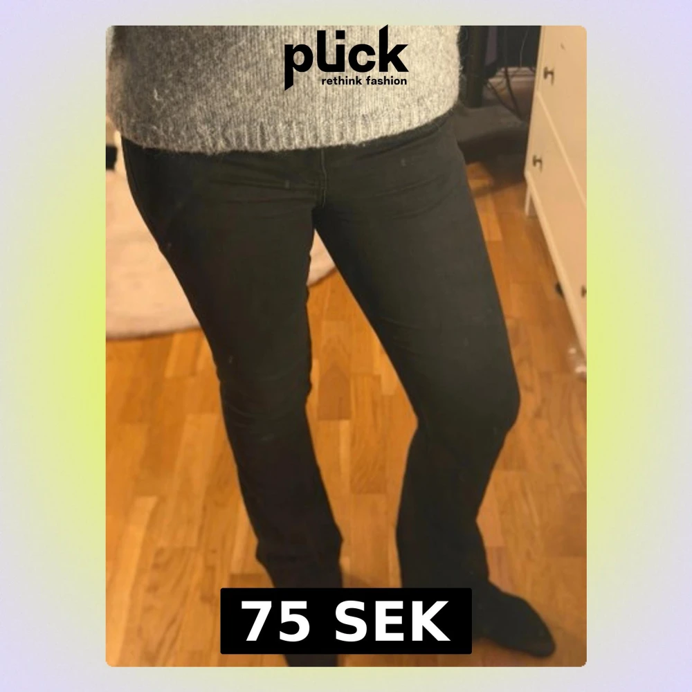 Snygga svarta bootcut jeans med klassisk femficksdesign och normal midja. Jeansen har en smal passform över låren och lätt utsvängda ben. Perfekta till en stickad tröja eller t-shirt. Materialet känns mjukt och stretchigt för extra komfort. Väldigt liten slitning som knapps märks av vid hälen⭐️