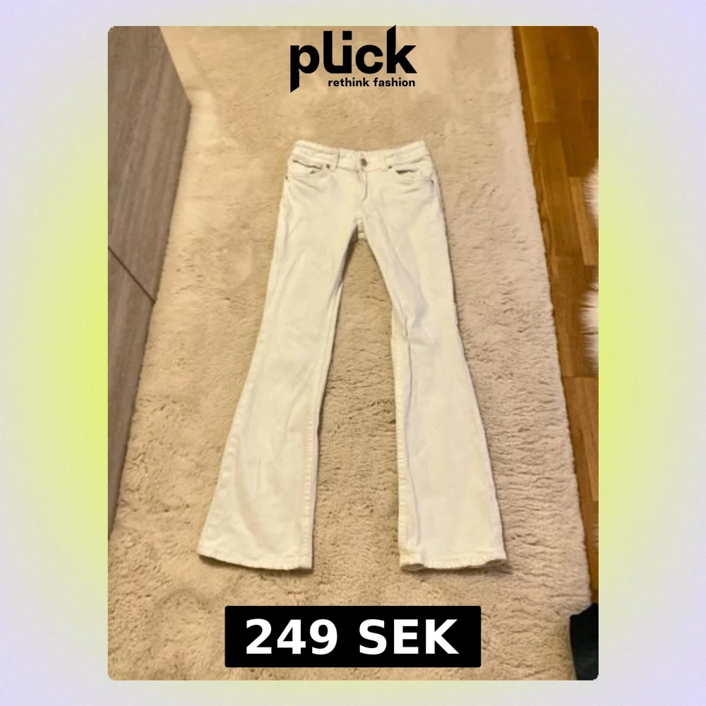 Snygga vita bootcut jeans med klassisk femficksdesign och knappgylf. Jeansen har utsvängda ben och är tillverkade i ett mjukt bomullsmaterial med lite stretch för extra komfort. Perfekta för en trendig och avslappnad look.