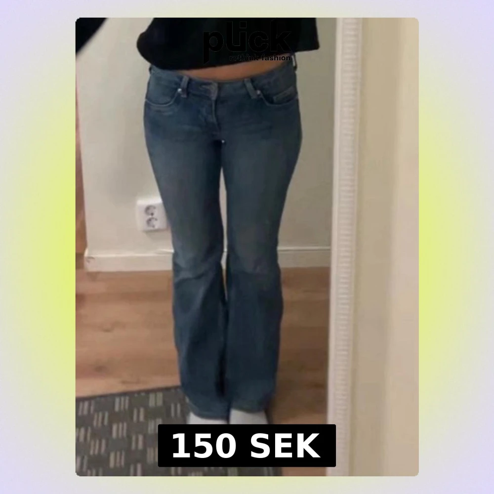Säljer ett par klassiska blå bootcut jeans med låg midja och fem fickor. Jeansen har en snygg tvätt och är perfekta för en avslappnad stil. Passar dig som gillar retrovibbar och vill ha ett par jeans som sitter skönt över höfterna.