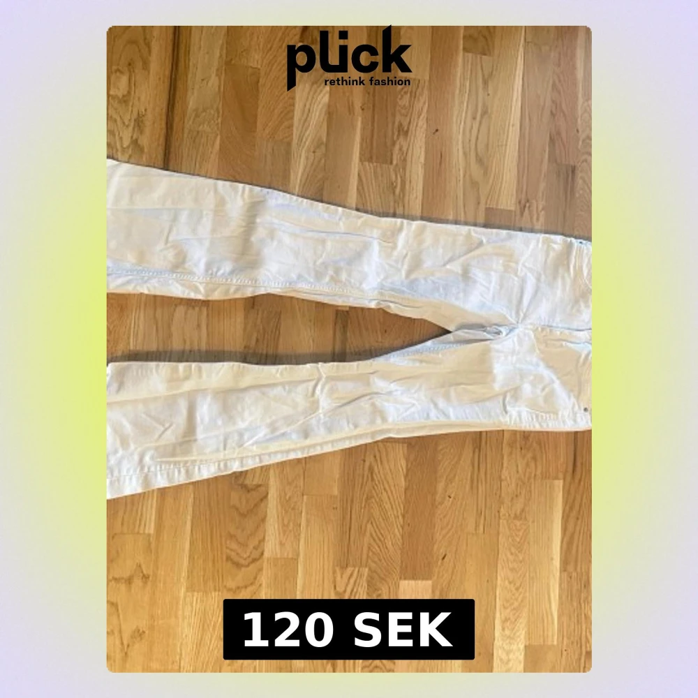 Säljer ett par vita bootcut jeans med klassisk femficksdesign. Jeansen har smal passform och är tillverkade i ett stretchigt material som sitter snyggt.