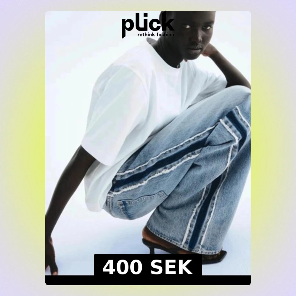 Säljer ett par ljusblå wide leg jeans med råa kontrastsömmar och mörkblå panel längs sidorna. Jeansen har hög midja och avslappnad passform, perfekta för en trendig och avslappnad stil. Materialet är klassisk denim i bomull.