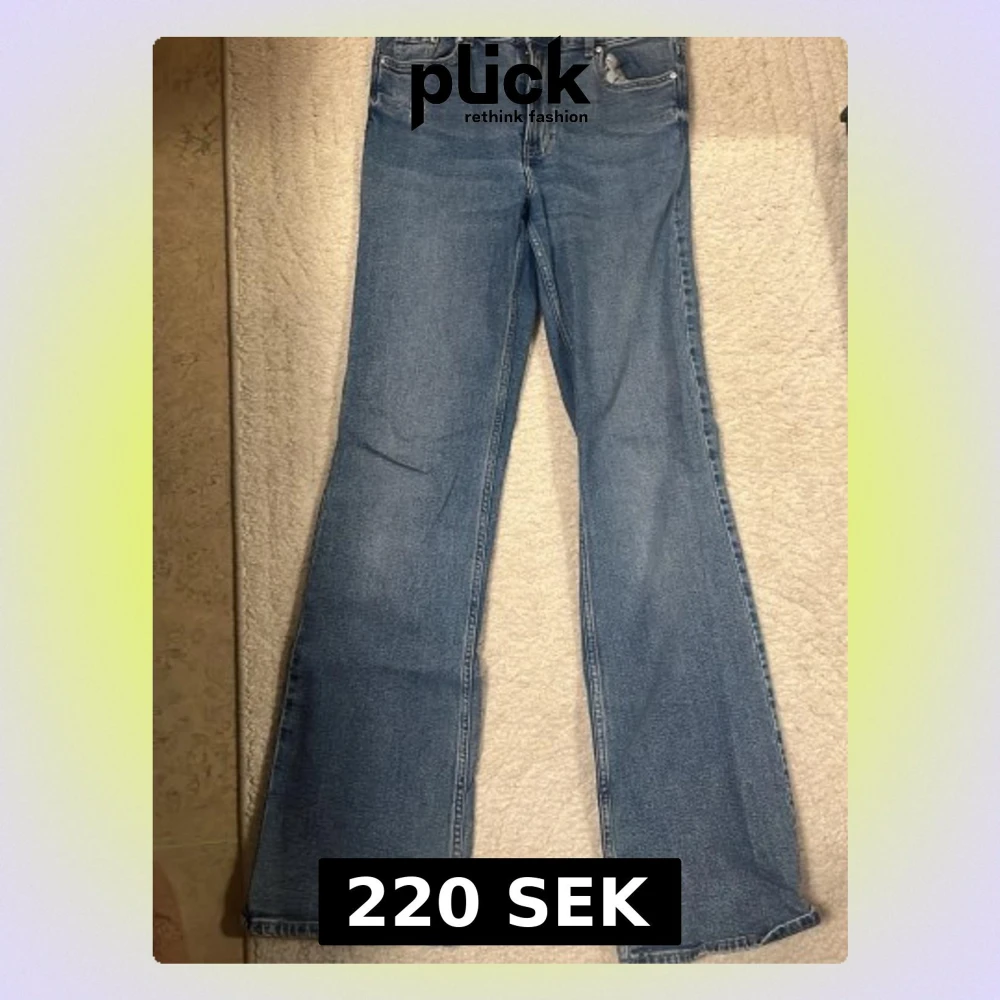 Ett par blå bootcut jeans med lätt slitna detaljer vid fickorna.