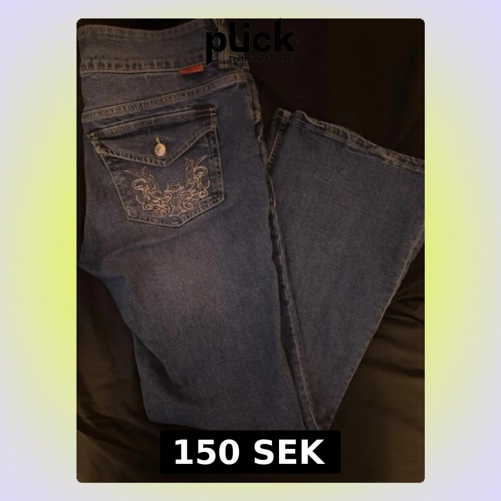 Snygga mörkblå jeans från Angelic/H&M med unik broderad design på bakfickan och knappdetalj. Klassisk femficksmodell i med bootcut. Perfekta för dig som vill ha ett par jeans med lite extra attityd.