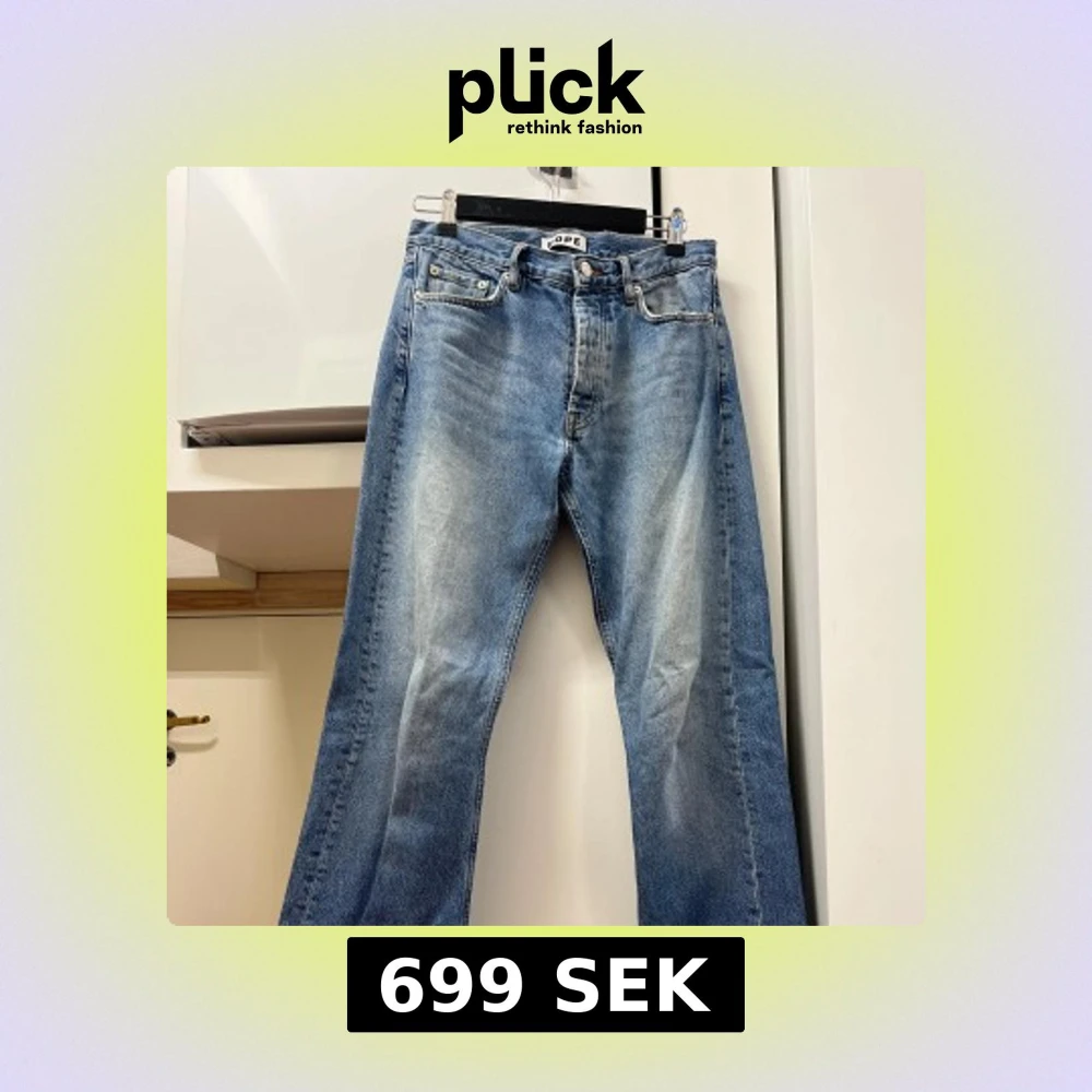 Två par jeans från Hope i storlek 28 för 699kr. Ett par i klassisk blå denim och ett par i grått. Jeansen är använda vardagligen och båda har varsin ihopsydd ficka och uppslitet tyg vid nederkanten.