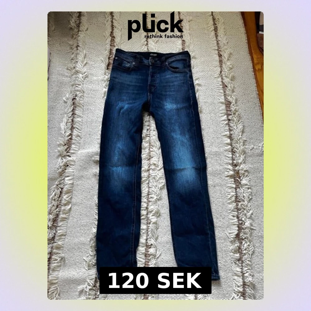 Säljer ett par mörkblå jeans från Jack & Jones med raka ben och klassisk femficksmodell. Jeansen har snygga slitningar och kontrastfärgade sömmar. Tillverkade i bomull med lite stretch för extra komfort. Perfekta till en avslappnad stil.