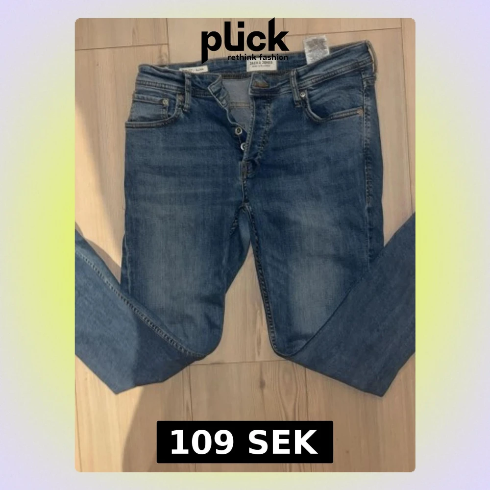 Säljer ett par blå slim fit jeans från Jack & Jones med klassisk femficksdesign och knappgylf. Jeansen har en snygg tvättad look och är tillverkade i bomull med lite stretch för extra komfort.