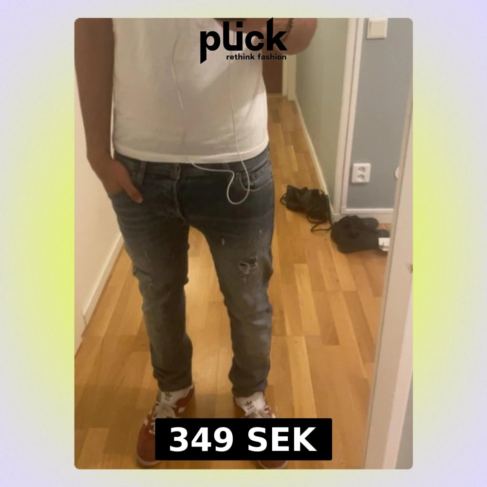 Säljer ett par blå jeans med slim fit och slitningar samt hål på ena benet. Jeansen har en klassisk femficksmodell och en tvättad look som ger en avslappnad streetstyle-känsla. Perfekta för dig som gillar en trendig och casual stil. Byxan har ett litet slitage vid skrevet men inget man märker.