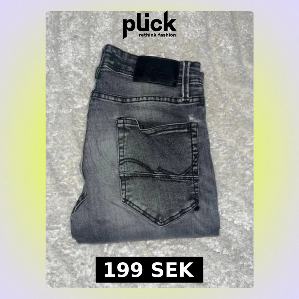 Jeans från Jack & Jones i grå tvätt med fade, modell Glenn som har en slim fit passform. Midja 33cm, längd 110cm. Obs jeansen har defekter. Baktill i det stora inringade området är tyget förtunnat. De två mindre omringade är det hål som slutessamman med trådar över. Obs storlekslapp saknas men jag skulle bedöma till w27 L34 men utgå efter mått. JAG SKICKAR EJ FLER BILDER NÄR JAG BÄR JEANSEN! för bättre inblick i passformen rekommenderar jag att googla på modellnamnet. Tar ej emot returer:)1,60
