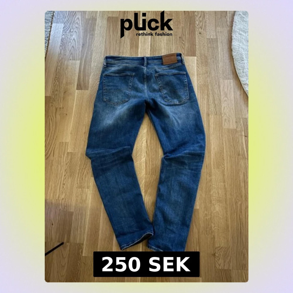 Säljer ett par klassiska blå jeans med raka ben och en liten slitning på benet som i mitt tyckte är ganska snyggt. Jeansen har fem fickor, normal midja och kontrastsömmar. Materialet är denim i bomull och de har en läderpatch bak i linningen.