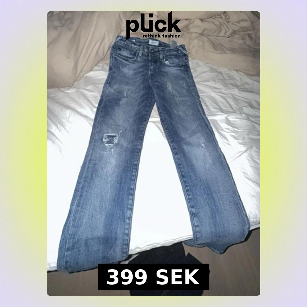 Säljer ett par blå bootcut jeans från Jack & Jones med slitningar och patchdetalj på ena benet. Jeansen har klassisk femficksdesign och tydliga tvättade partier för en cool, avslappnad look. Perfekta för dig som gillar en lite retro vibe.