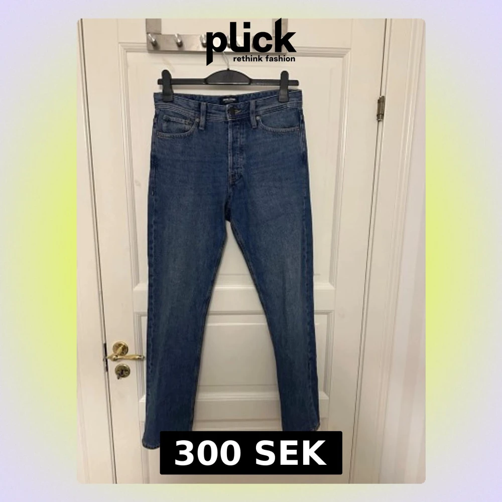 Säljer ett par klassiska blå jeans från Jack&Jones med rak passform och hög midja. Jeansen har fem fickor, bälteshällor och stängs med knapp och dragkedja. Tillverkade i slitstark denim som ger en tidlös look. Storlek 30/32