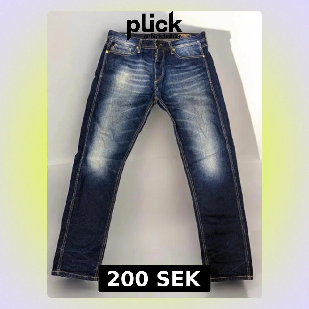 Säljer ett par mörk blåa jeans med raka ben. Jeansen har klassiska fem fickor, kontrastsömmar och en cool tvättad look. Perfekta för dig som gillar en avslappnad och trendig stil. Dem är i mycket bra skick. Inget dåligt med byxorna🤩
