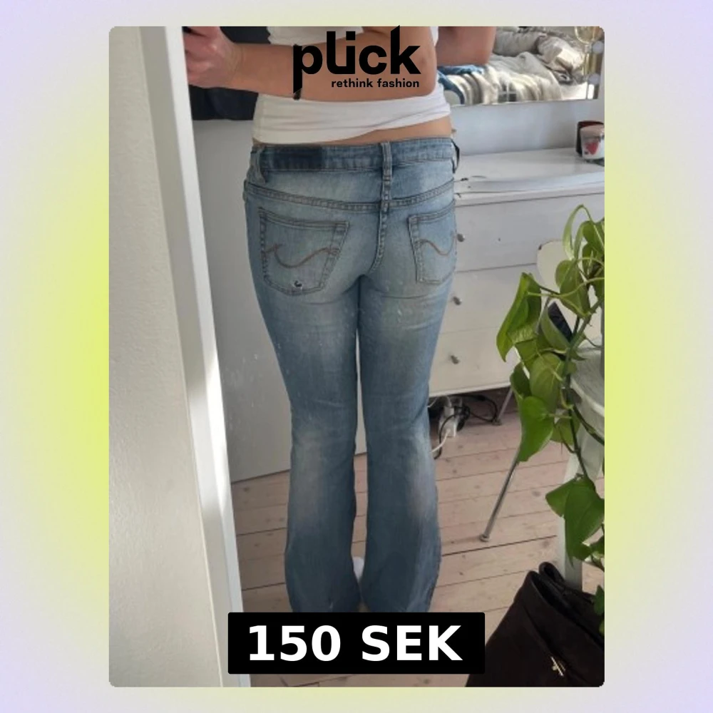 Säljer ett par ljusblå bootcut jeans. De har ett litet hål i höger bakficka men är annars i väldigt bra skick🤍