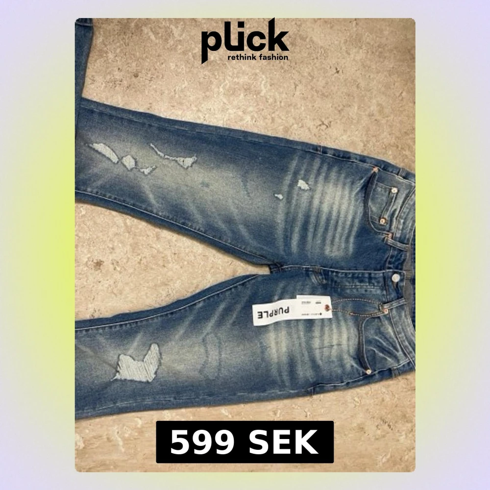 Säljer ett par blå jeans från Purple med snygga slitningar och distressed detaljer på benen. Jeansen har klassisk femficksmodell, normal midja och raka ben. Materialet är denim i bomull med tvättad look och ljusa partier.