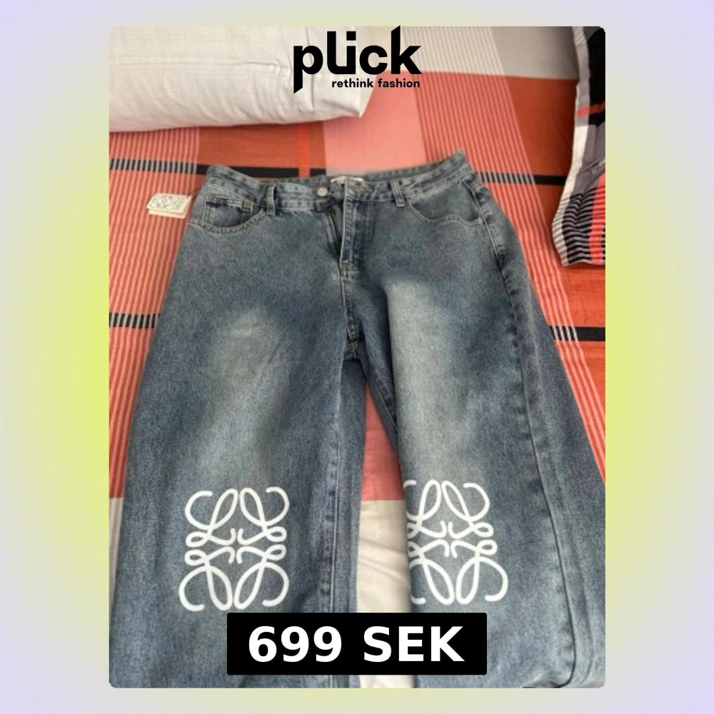 Säljer ett par blå baggy jeans från Loewe med vita grafiska tryck på båda benen. Jeansen har klassisk femficksmodell, knappgylf och en grön patch med Loewe-logga bak. Tillverkade i denim med en cool tvättad look och bred passform. HELT NY O OANVÄND