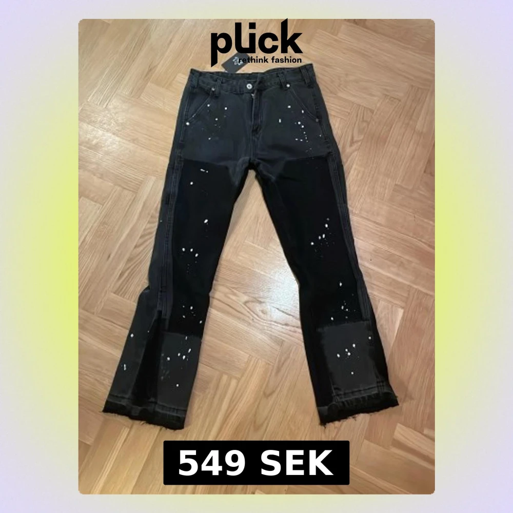 Unika svarta jeans med vita färgstänk och råa, avklippta benslut. Jeansen har raka ben, fem fickor och coola detaljer som ger en trendig streetwear-känsla. Perfekta för dig som vill sticka ut med din stil.