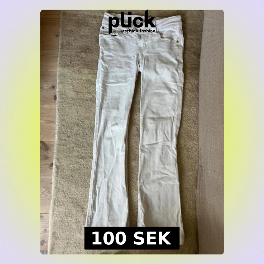 Säljer ett par vita bootcut jeans från 157 med klassisk femficksdesign och dragkedja. Jeansen har raka ben med lätt utsvängning nedtill och är tillverkade i ett mjukt bomullsmaterial. Perfekta för en clean och stilren look.