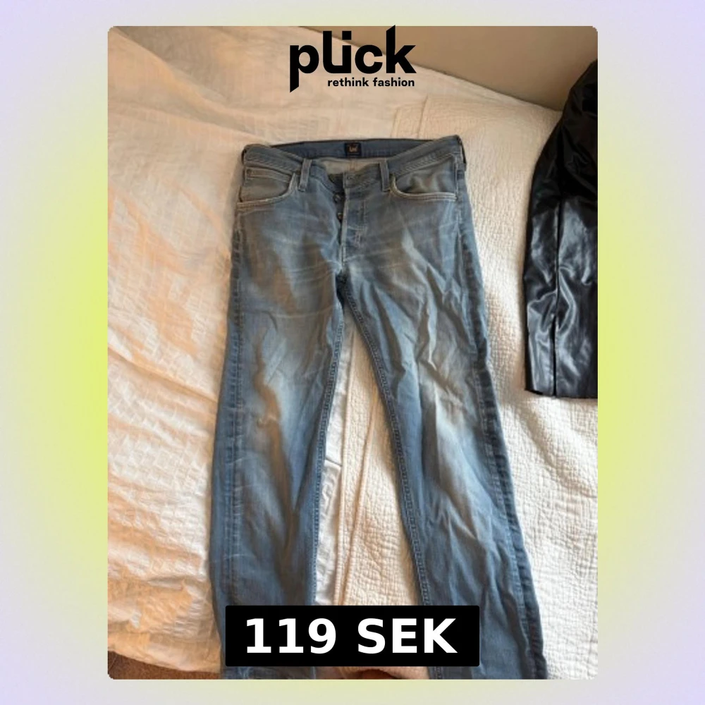 Säljer ett par ljusblå jeans från Lee med klassisk femficksmodell och knappgylf. Jeansen har raka ben och slitningar för en avslappnad look. Tillverkade i bomull med en skön passform. Perfekta för dig som gillar en tidlös och enkel stil.