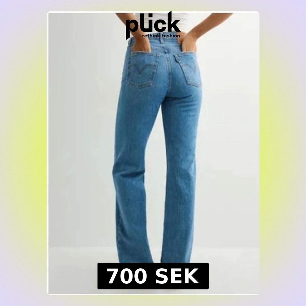 Säljer ett par blå jeans med raka ben och klassisk femficksdesign. Jeansen har hög midja och är gjorda i denim. Perfekt för dig som gillar en enkel och tidlös stil.