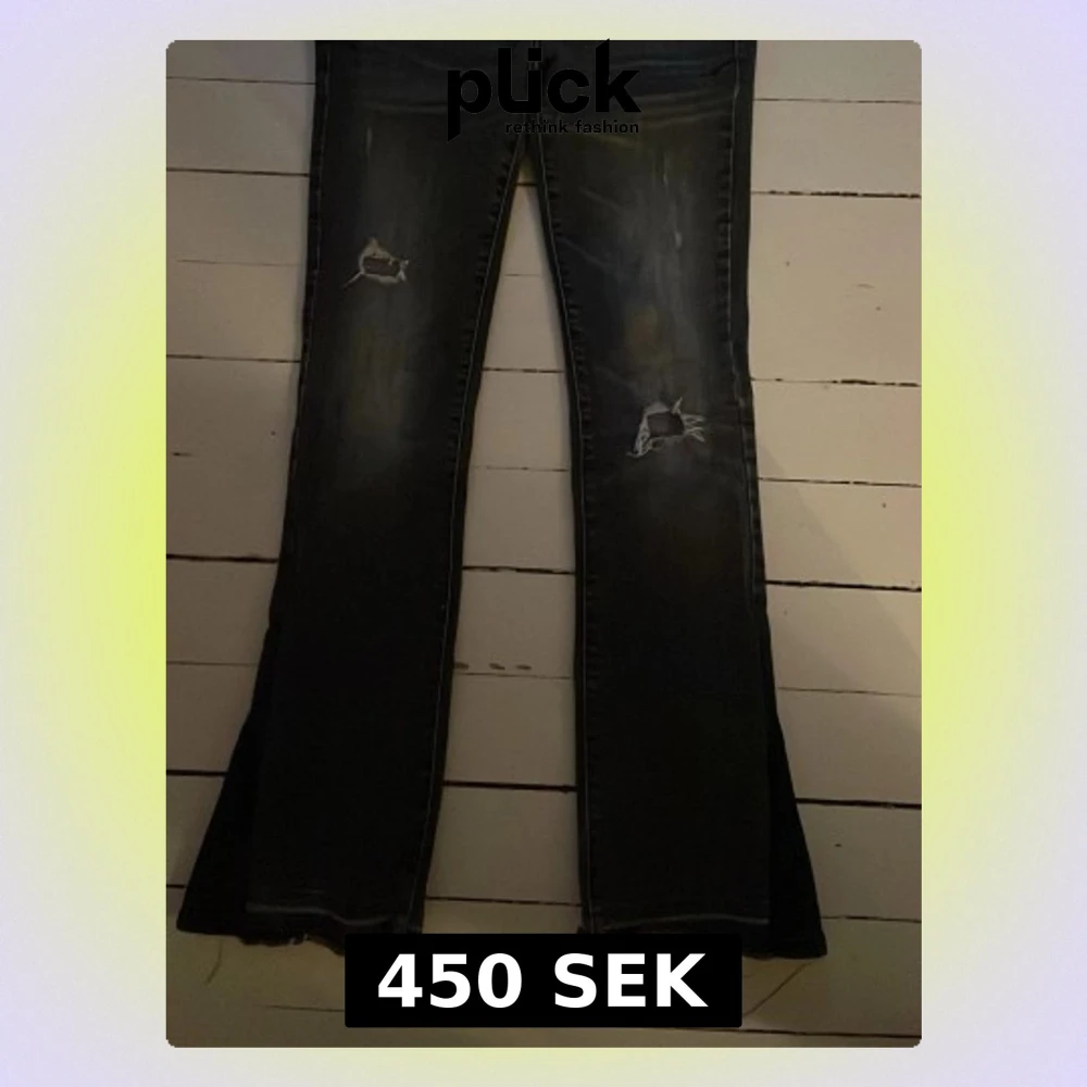 Snygga svarta bootcut jeans med slitningar på knäna och råa, fransiga benslut. Jeansen har en lätt tvättad look och extra slitsar nertill för en trendig vibe.💕STORLEK W25 L30