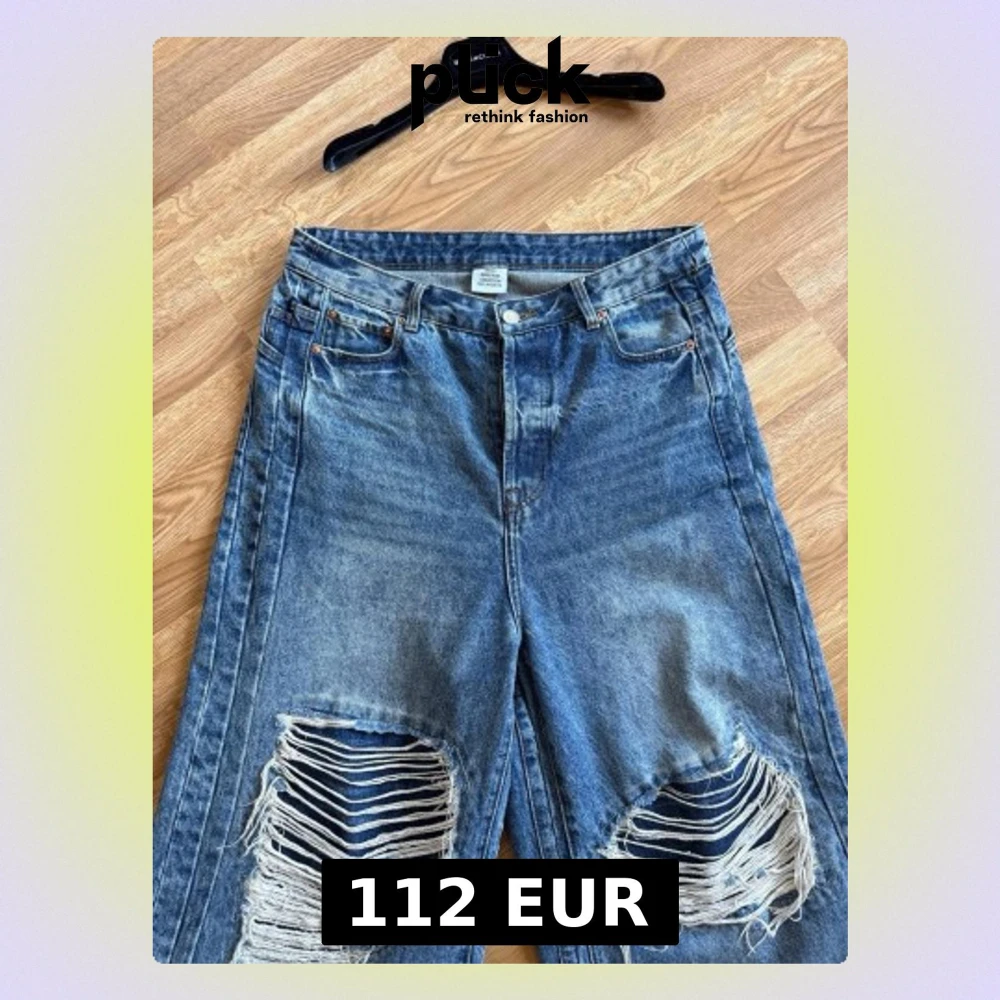 Säljer ett par blåa jeans från Zara med bred passform och stora slitningar över knäna. Jeansen har hög midja, klassiska fem fickor och råa kanter nertill. Perfekta för en avslappnad och trendig streetstyle-look.