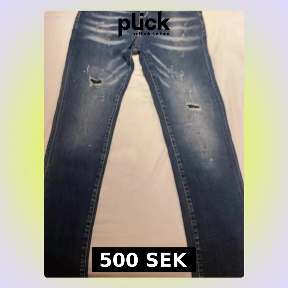 Säljer ett par blå jeans med slitningar och hål på båda benen. Jeansen har en klassisk femficksmodell och raka ben. Materialet är denim och de har en cool, avslappnad look med lite färgstänk på framsidan.