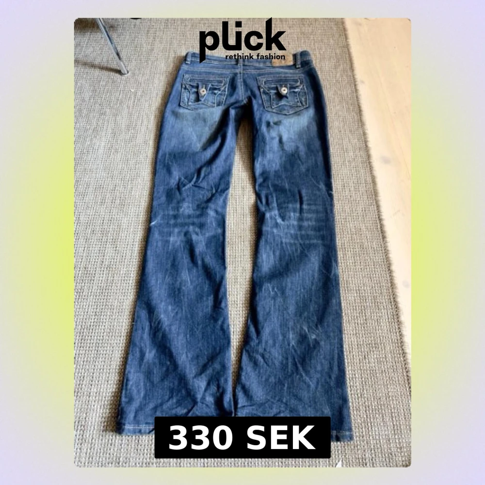 Säljer ett par blå bootcut jeans med snygga fickor bak som har lock och knappdetaljer. Jeansen har en klassisk tvättad look och raka ben med lätt utsvängning. Perfekta för dig som gillar retrostil och vill ha något bekvämt och trendigt.